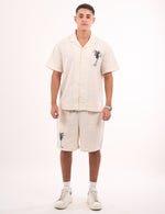 Relaxed-fit beige short-sleeve shirt and matching shorts adorned with palm tree embroidery. A tropical-inspired casual set ideal for vacation wear.