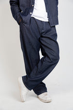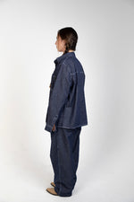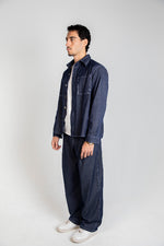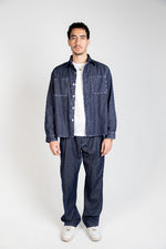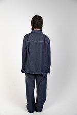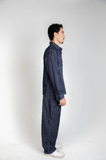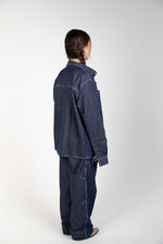 A unisex raw-denim set designed with bold white stitching for a crisp contrast and a modern, structured look.